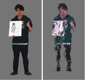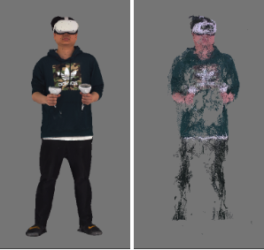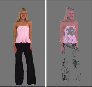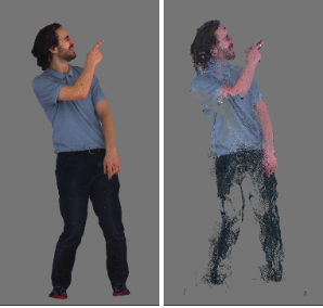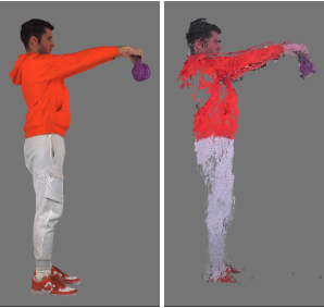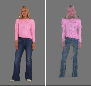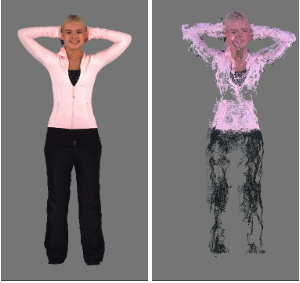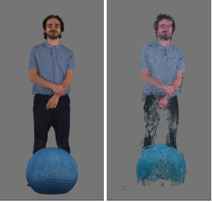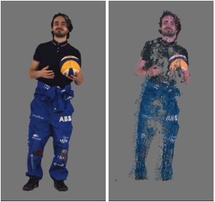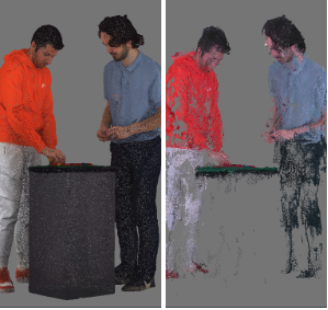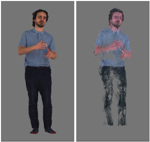 The following samples give characteristics of the Dual-Quality Point Cloud sequences in the dataset, with the left image recorded using a high-end and the right image recorded using a consumer grade capturing system: