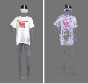 A mannequin wearing a head-mounted display (HMD) and a t-shirt with various logos stands still. The t-shirt shifts slightly
